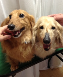 シュナウザーとコッカーのミックスのファルコンちゃん♪ 頭と耳はのばし中です(^-^)/はやくリボンつけて結びたいね☆ ミニチュアダックスのラッキーくんとクッキーくんです(^^) シャンプーしてすっきりしたのか二人とも笑顔( ´ ▽ ` )