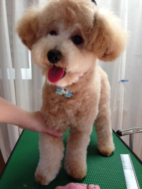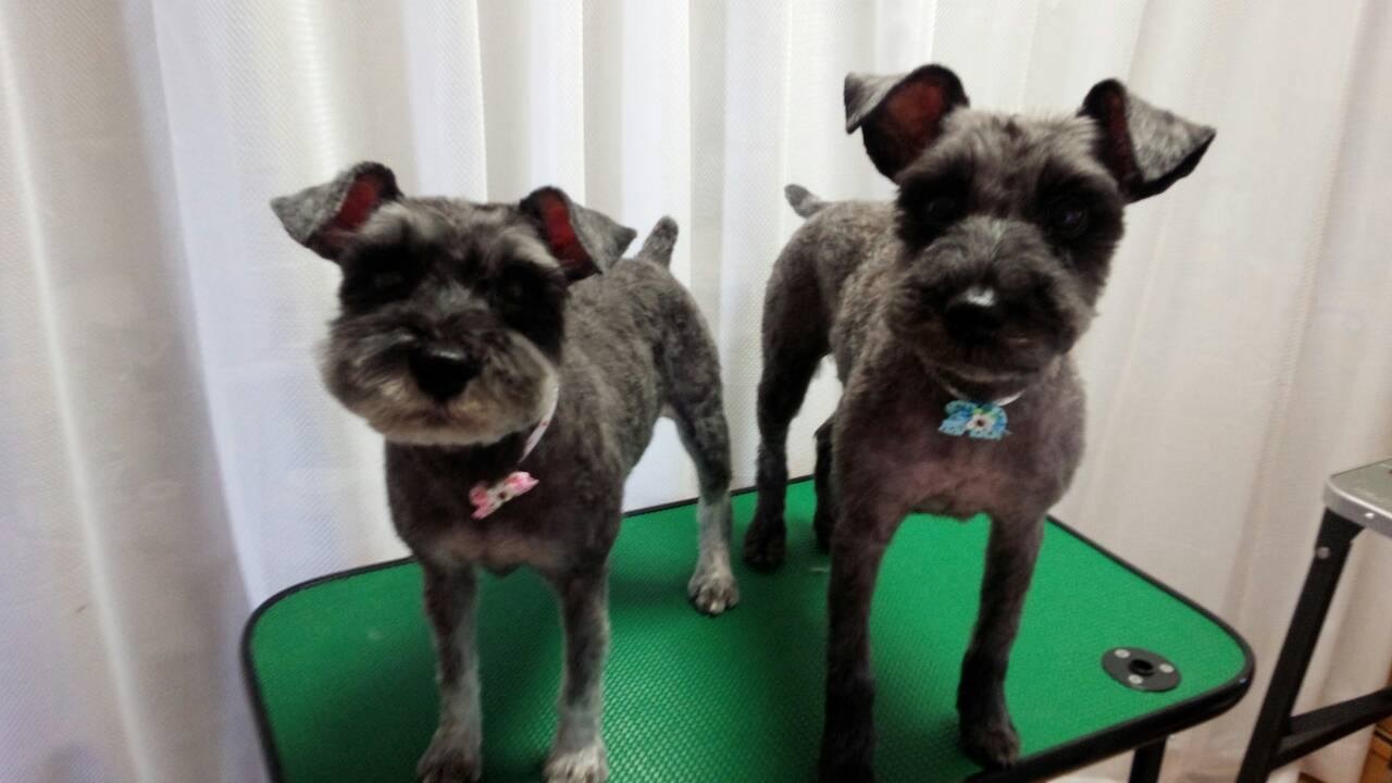 ミニチュアシュナウザーの右がセナくん、左がモナちゃんです(^O^) 体は短くして、お顔はセナくんがシュッと、モナちゃんは女の子っぽくふんわりにしました☆ トイプードルの茶々丸くんです(*^^*) 今日はシャンプーコースでふんわり♪ まだ9ヶ月だけど、前回来たときより大きくなったねー(^O^)